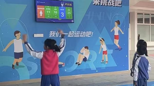在新沙小学,教室外的柱子上都安装了AI互动锻炼屏,成为最受小学生们欢迎的运动设施,孩子们跟随着屏幕指令完成深蹲、开合跳,通过人脸识别获得积分,教室外的露台和连廊也成了孩子们的运动空间,跳绳、丢手绢、扔沙包,玩得不亦乐乎……